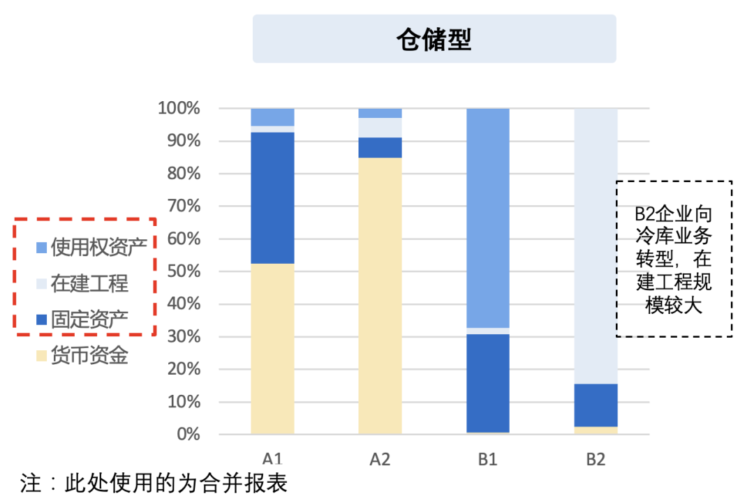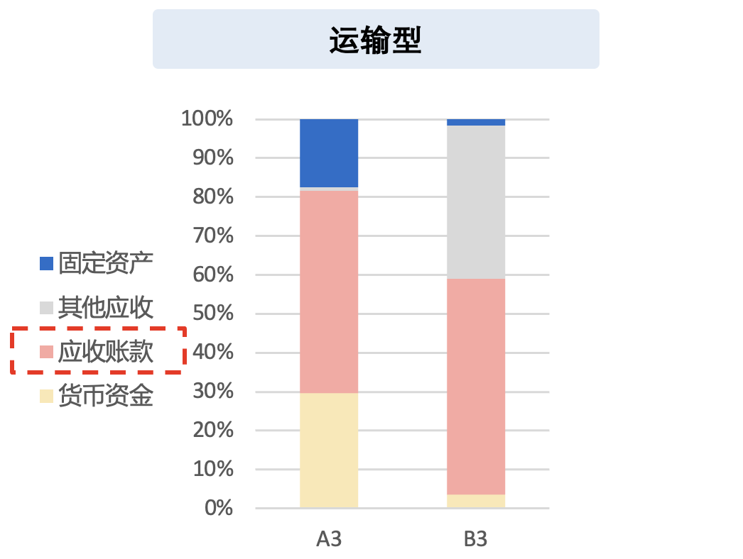 上市公司賬面貨幣資金明顯多于新三板企業。此外,倉儲型企業的核心資產主要集中在長期資產。冷庫屬于相對重資產的業務,雖可租入方式輕資產運營,但企業仍會自持一定規模冷庫滿足實際需要;而偏運輸型企業的應收賬款占比最高,相對輕資產。