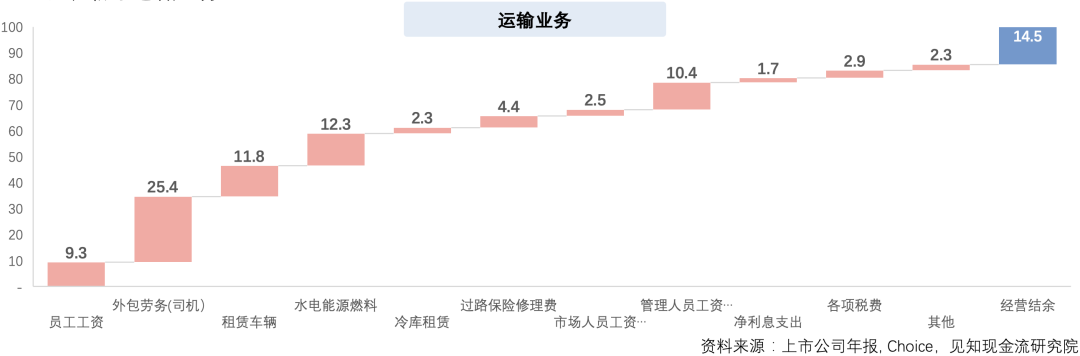 我們對倉儲、運輸的業務分別進行粗略測算,分析他們每百元現金流入的付現成本。運輸方面,工資性支出占比達到40%左右(自有車隊遠小于實際承運規模);此外,燃料費用占比達到15%左右,而管理相關開支占比較小,約10%。百元流入最終經營結余約14.5元,低于倉儲業務。
