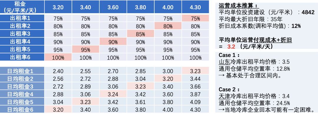 我們通過對比不同樣本和公開信息,基于平均最長折舊年限35年的現狀,對冷庫在各個租金水平下的出租率盈虧平衡點進行測算,并制作以下表格。
