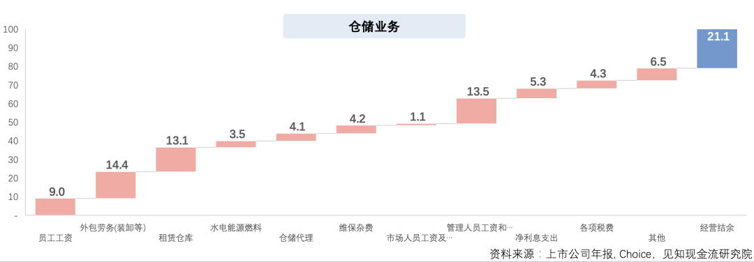 我們對倉儲、運輸的業務分別進行粗略測算,分析他們每百元現金流入的付現成本。倉儲業務方面,占比最高的主要為工資性支出、倉庫租賃以及管理支出。每百元流入可形成21.1元經營結余,現金流情況較好。