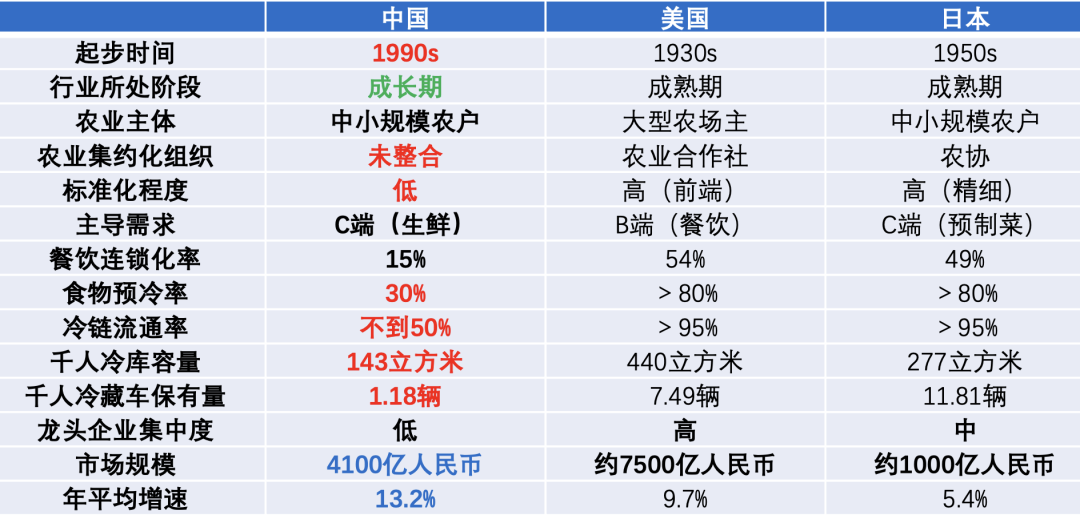 對比中美日冷鏈物流的行業情況,不難看出我國冷鏈物流行業還處于相對初始階段,在基礎設施、體系建設、行業標準等方面相對不足,行業成長潛力是較為長期的。