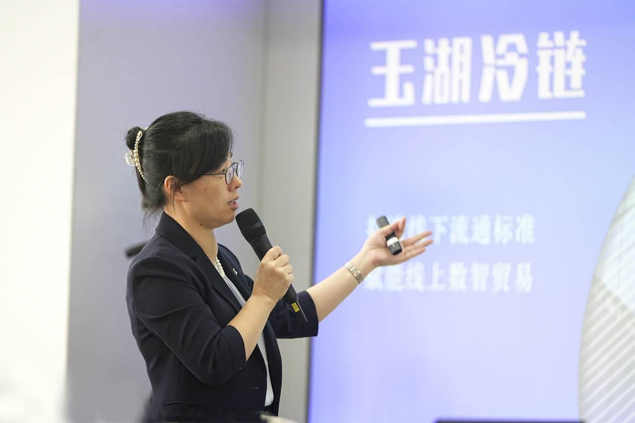 玉湖冷鏈董事長兼總裁盧朋主持座談會,香港玉湖集團執行董事黃錚洪、玉湖冷鏈線上事業部總經理李煒鑫分別就食品進出口貿易及供應鏈金融服務進行了專題介紹。