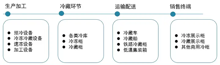 從產業鏈看,冷鏈物流涵蓋冷凍加工,冷藏貯藏,冷鏈運輸和冷鏈銷售全過程。冷鏈物流產業鏈中各環節所需設備主要有預冷設備、冷庫、冷藏車、冷藏集裝箱和銷售終端設備等。