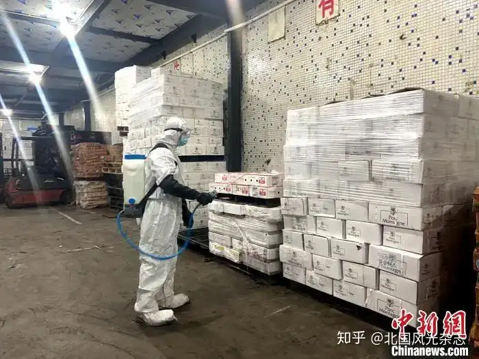 根據進口冷鏈食品物流特點,在完成新冠病毒檢測采樣工作后,分別在口岸查驗、交通運輸、掏箱入庫、批發零售等環節,在其首次與我境內人員接觸前都應實施預防性全面消毒處理。