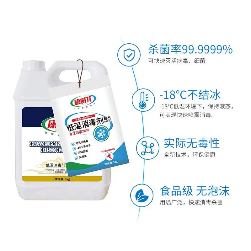 康威龍的低溫消毒劑低溫環境下無泡沫,不凝固,不結冰。冷庫使用康威龍低溫消毒劑消殺后,多次核酸抽查檢測沒有活性病毒,沒有活性細菌。