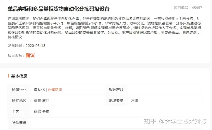 對于裝卸過程中出現貨品品名繁雜、人工分揀效率低下的問題,萬翔冷鏈經過慎重篩選和評估,找到了大學仕平臺,針對以上問題發布了“單品類柜和多品類柜貨物自動化分揀碼垛設備”的自動化升級改造需求。