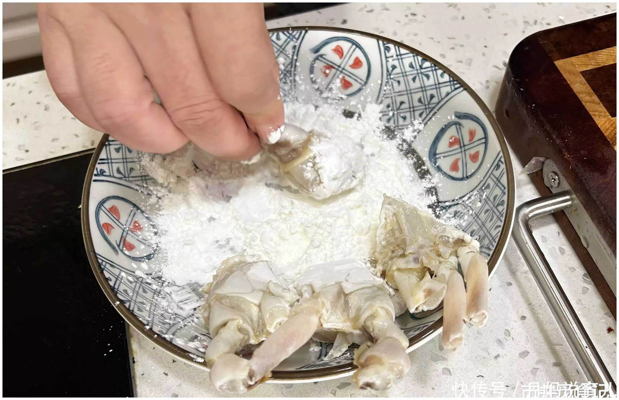 3、盤中放入一些干淀粉,將螃蟹裹上淀粉,漏出肉的部分可以多裹一些。