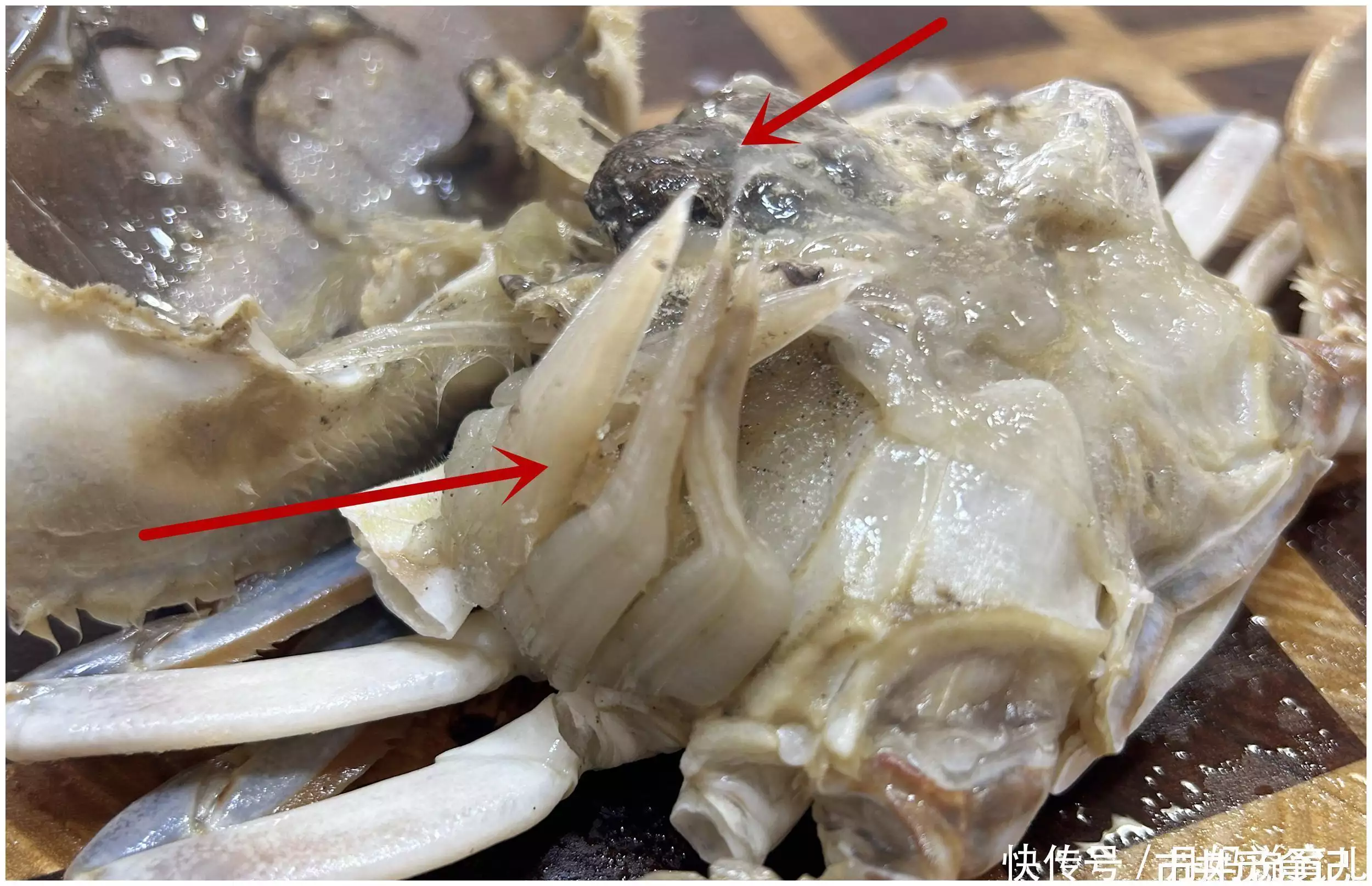 1、冰凍的梭子蟹買回來以后解凍,只要沒有出現明顯的臭味,有腥味都是正常的,梭子蟹從尾部開殼,去掉腮和中間的胃,一些黑色的膜也清洗掉。