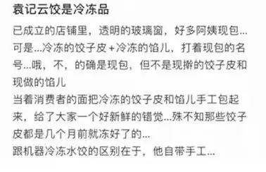 該網友表示,袁記云餃用冷凍的餃子皮和冷凍的餃子餡,當著消費者的面手工包起來,給了大家一個好新鮮的錯覺,殊不知那些餃子皮和餡都是提前凍好了的。